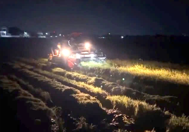 Nông dân phường Bắc Gianh gặt lúa xuyên đêm. ẢNH: THANH LỘC